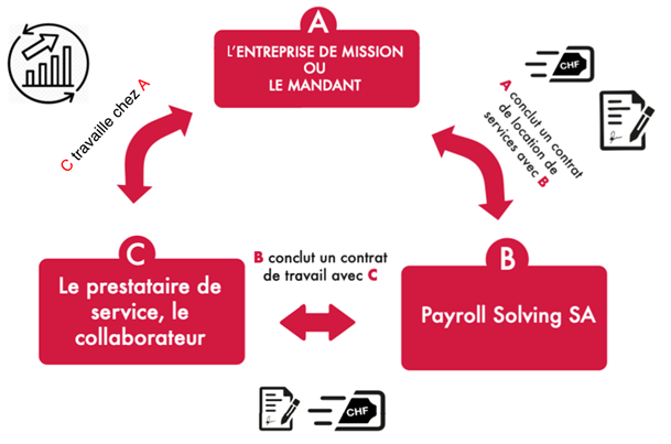 Payroll Solving SA signe un contrat de location de services avec le mandant, l'entreprise de mission et un contrat de travail avec le demandeur d'emploi, le consultant ou l'entrepreneur.